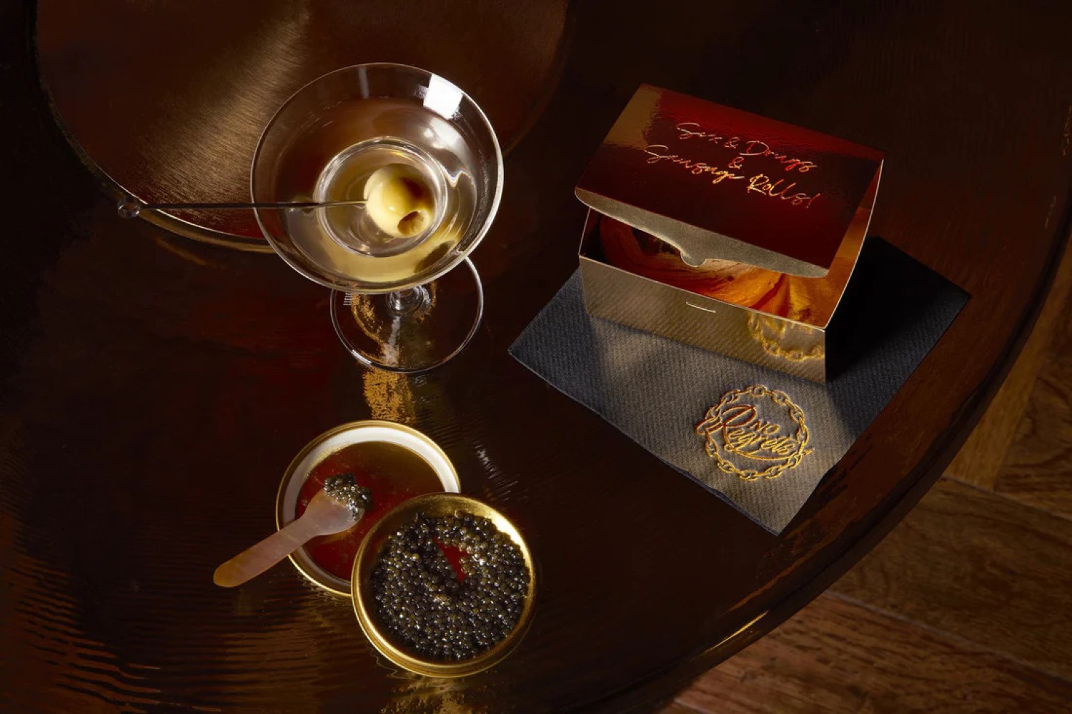 Inside, the mood is dark, lush, and ever so slightly wicked. Velvet banquettes glow under candlelight, while whimsical details, a trio of ice-cold mini martinis delivered on a silver tray engraved Enjoy Your Flight, or the gleaming gold toilet that practically demands admiration, remind you that Webster’s world has always been one of playful decadence.
