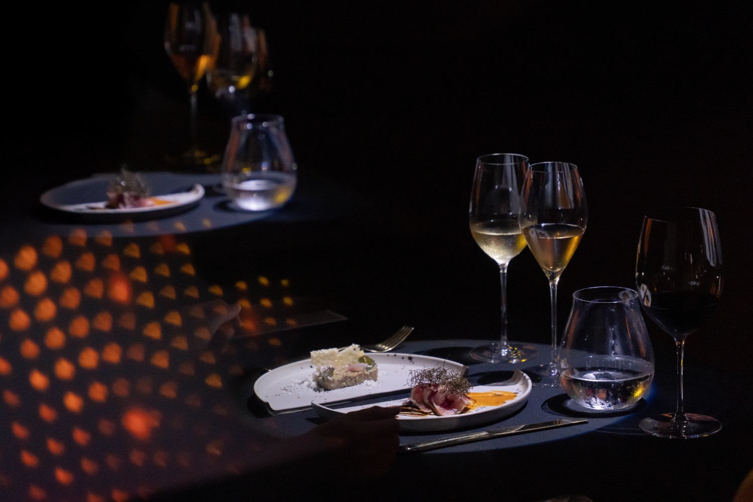 Guests entered through a lantern-lit corridor where shifting hues created a dance of shadow and radiance. Four monochrome canapés introduced the theme, foie gras blackcurrant spheres, jasmine-kissed sea snail tartlets, crab cones with yuzu, and crispy cockles, each a meditation on balance.