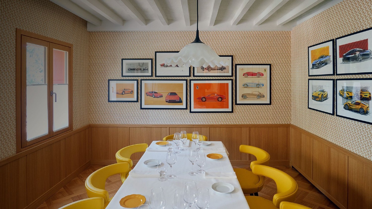Step into the main dining hall and you’re greeted by pixelated Prancing Horse wallpaper, arched ceilings, and terracotta flooring in red and ivory hues, a nod to traditional trattoria tablecloths. Oak-paneled walls, yellow leather benches, and collages of Ferrari engines create a tactile warmth, while historic yearbook images and even a Formula 1 front wing remind guests they are dining in a living legend.