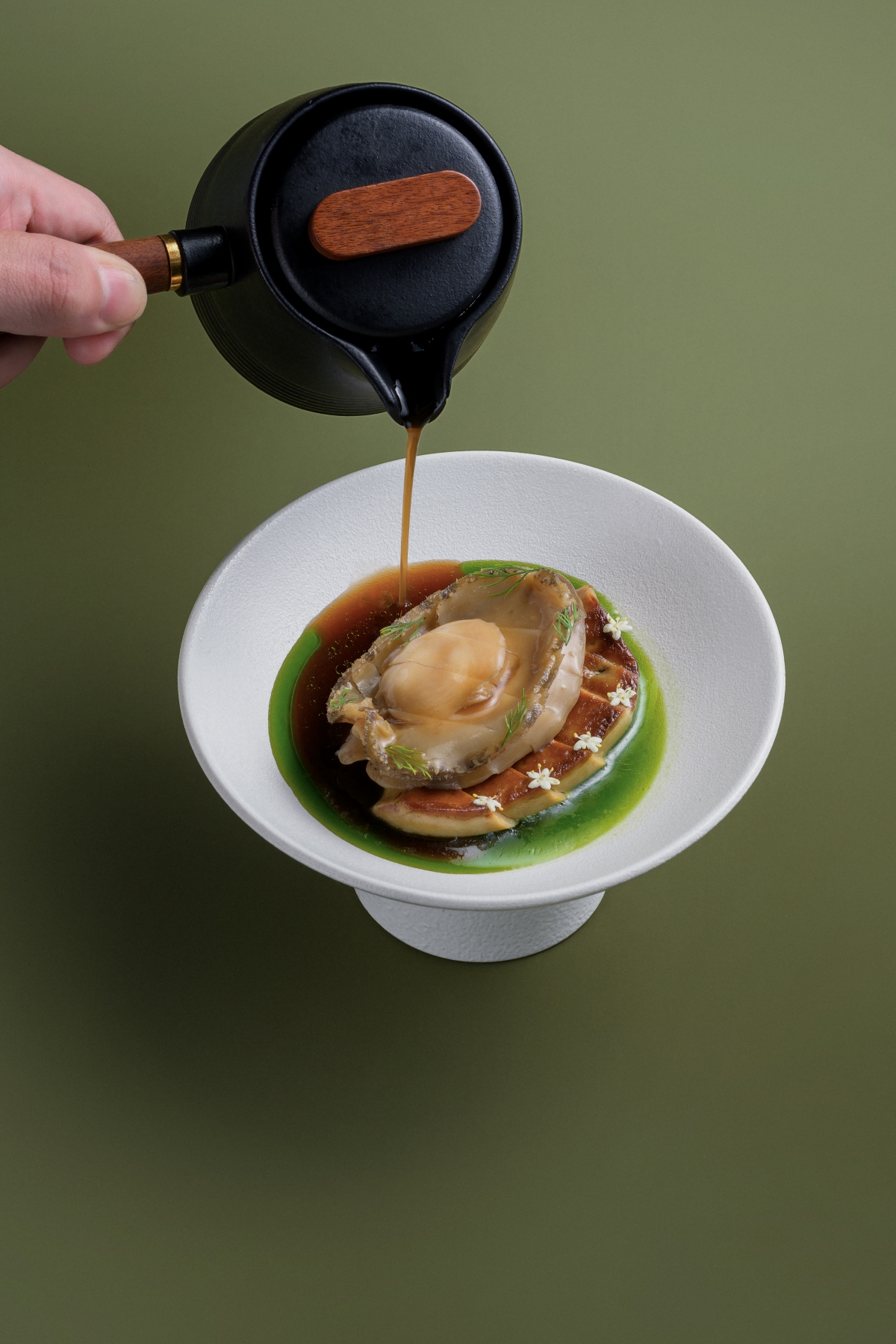 Seasonal additions further highlight the kitchen’s technical discipline. The Eel Soup layers freshwater eel and sea cucumber within a clear chicken consommé, brightened subtly by Asian pear and winter melon. Light yet deeply structured, it underscores the precision required in broth-based cuisine. Equally refined, The Abalone pairs tender abalone with foie gras and oolong, balancing richness with tannic clarity and deliberate proportion.