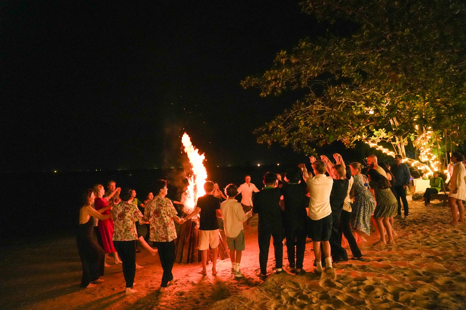 A vibrant evening of gourmet dining, live entertainment, and beachfront festivities including bamboo dance, fire performances, and a bonfire countdown.