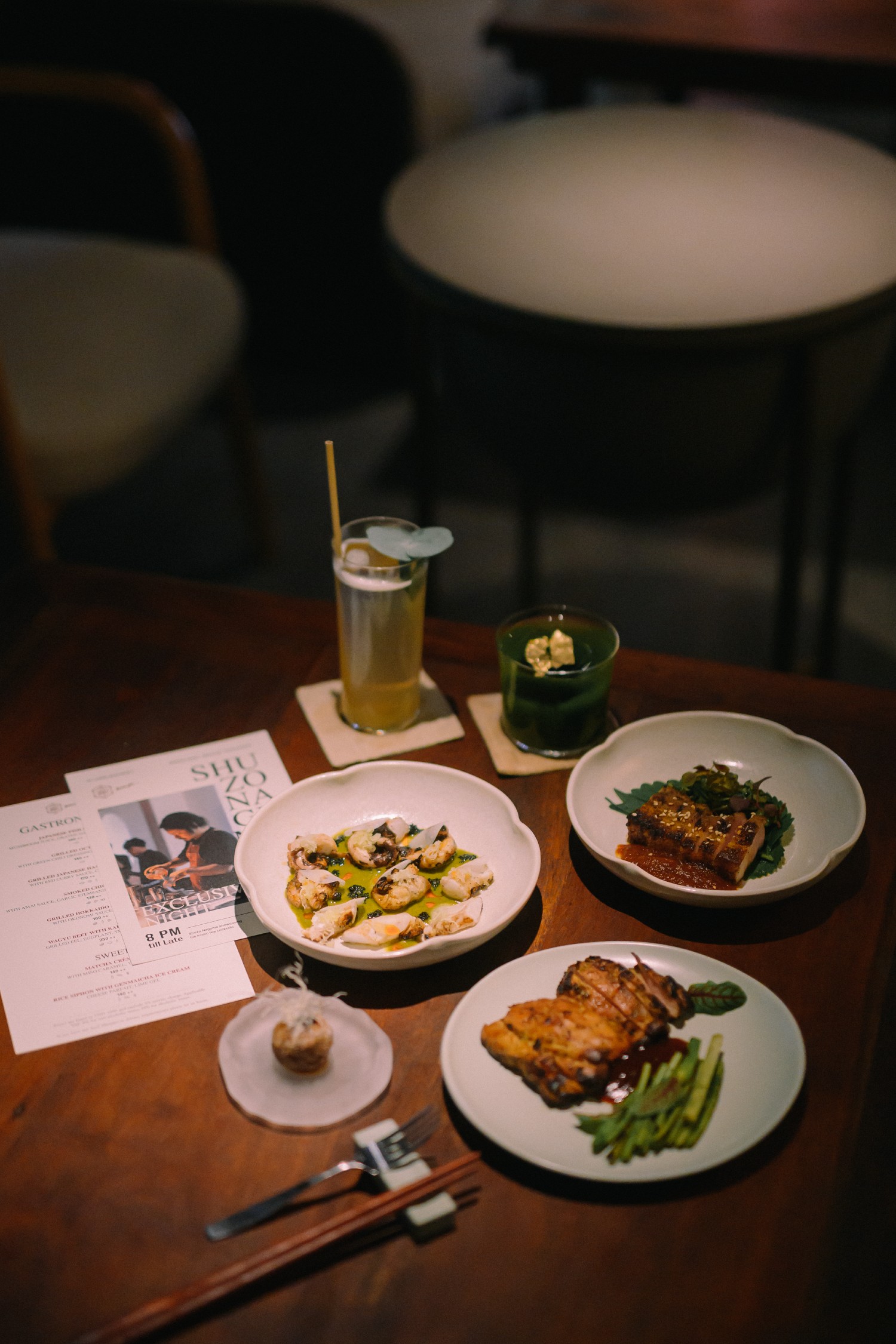 The tasting menu featured three Japanese tea cocktails - Genmai & Eucalyptus Shandy, Hoji et Paradis, and Green Tea Fashioned - each expressing a different interpretation of harmony: Genmai & Eucalyptus Shandy carried a calm, earthy tone; Hoji et Paradis bridged roasted warmth and tropical sweetness; Green Tea Fashioned, made with Kyoto’s single-origin matcha, revealed depth and quiet sophistication.