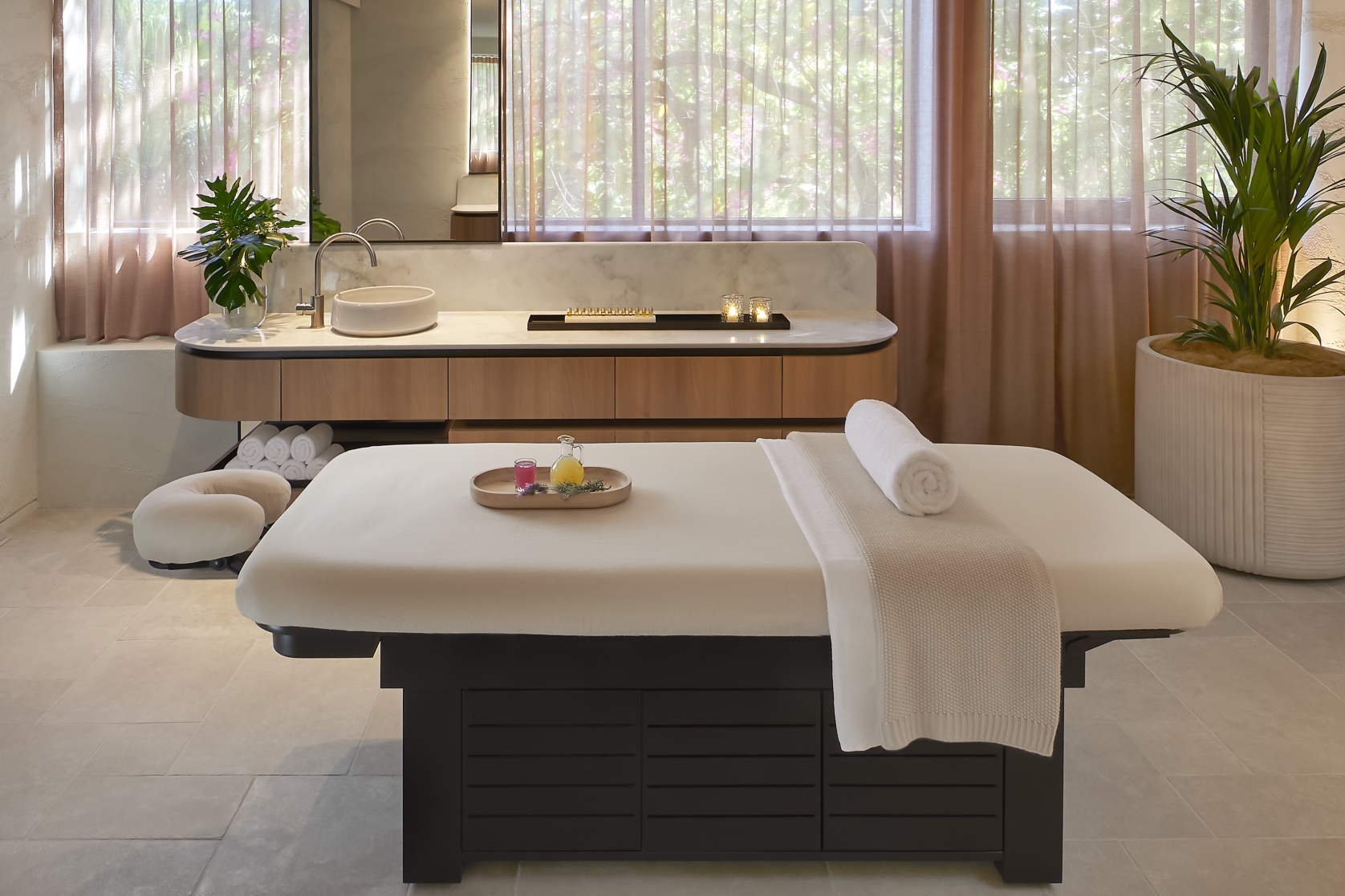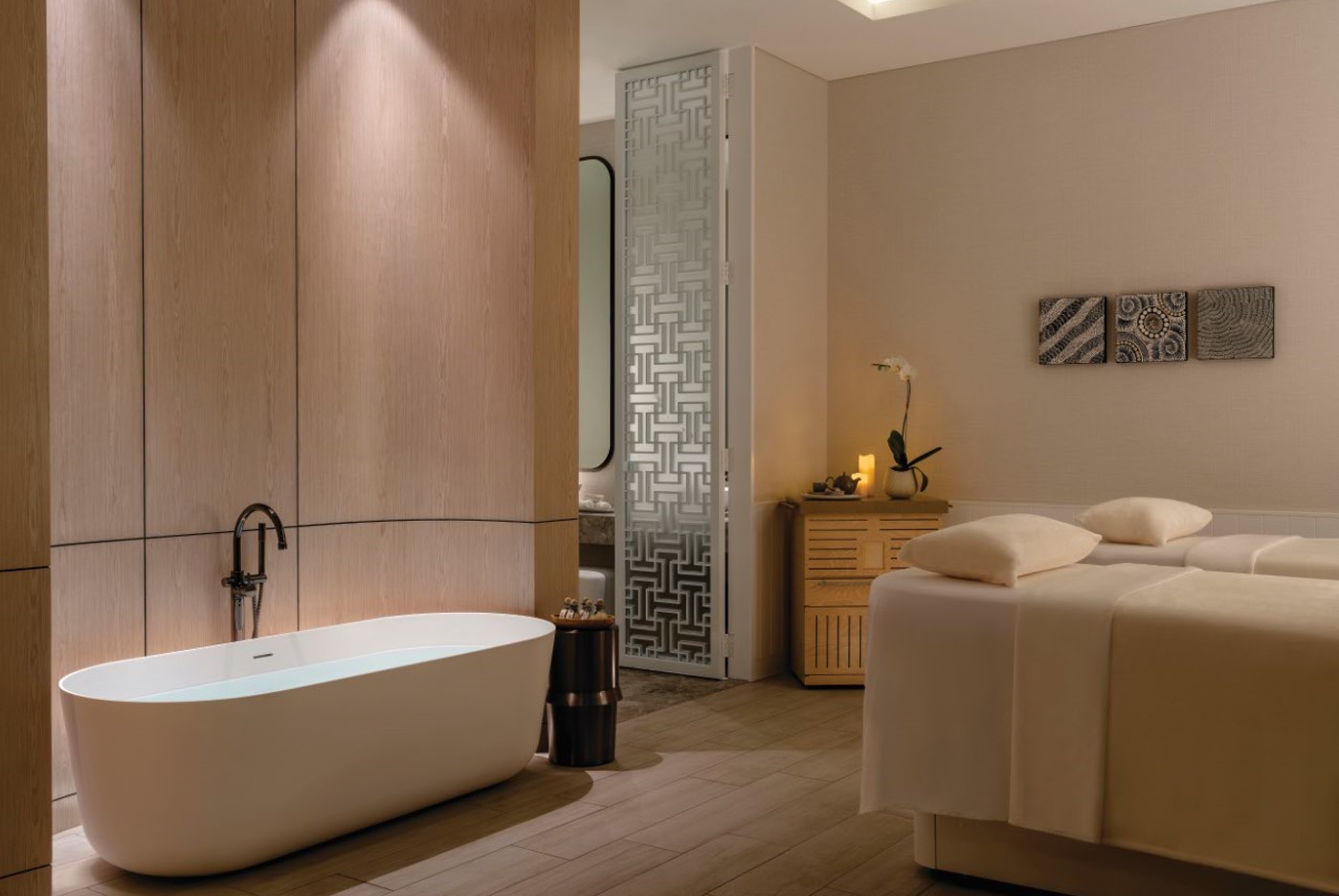 The serene setting fuses contemporary aesthetics with subtle nods to Chinese tradition. Marble, herringbone flooring, and arch-shaped accents come together in a calming, neutral colour palette, complemented by the subtle scent of Chuan signature elements.