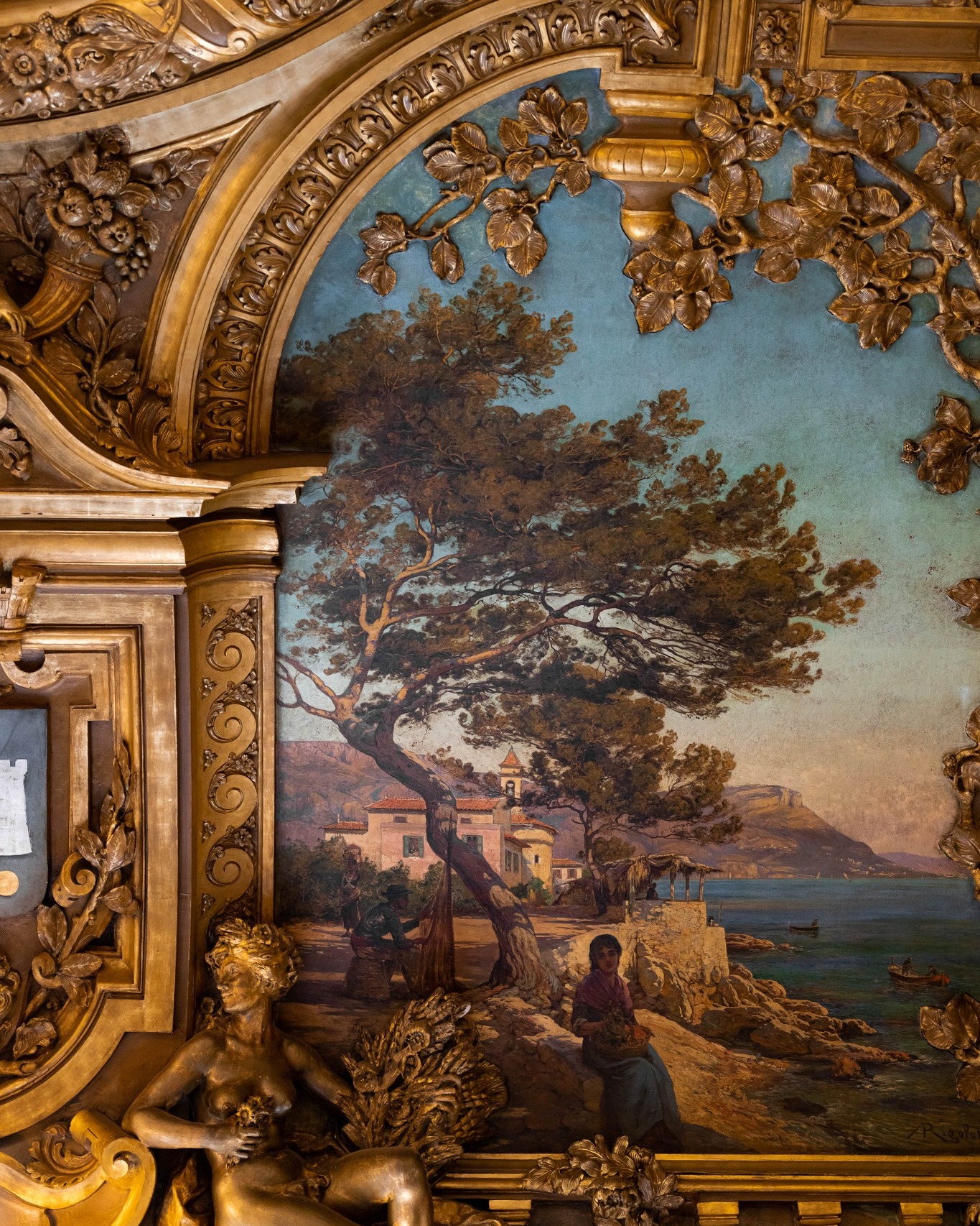 The dining room inspires awe without a word. Sweeping frescoes rise like open skies, brushed with clouds, landscapes and distant light. Gold leaf glimmers softly against dark wood, while velvet banquettes embrace guests in rich, enveloping comfort. Every wall holds a story. Every surface feels touched by another era. One sits. One breathes. One simply looks.