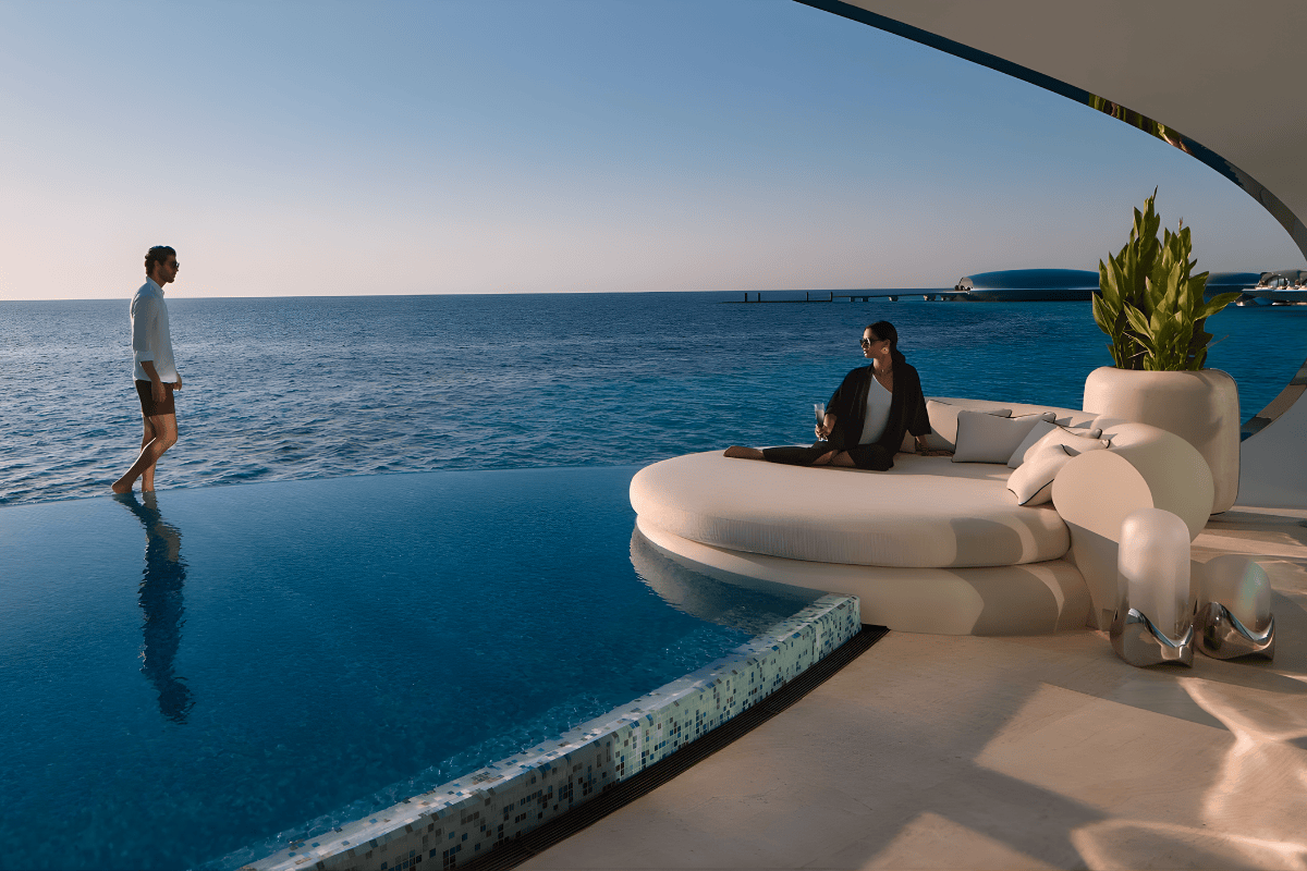 The design is, without question, Shebara’s most memorable signature. Across 73 overwater and beachfront villas, architecture takes on an almost otherworldly form. Each stainless-steel structure appears like a luminous orb suspended between sea and sky, reflecting the shifting light of its surroundings with mirror-like softness. The effect is bold, but never overpowering. Instead, the villas seem to dissolve into the horizon, allowing the natural environment to remain the true protagonist.