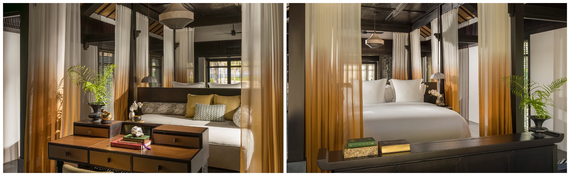 Within these familiar contours, a softer light emerges. Pale linens, chartreuse accents, and mustard hues reflect the rhythm of the surrounding landscape. Local artistry breathes through hand-carved details and woven textures, a testament to Vietnam’s enduring craft traditions.
