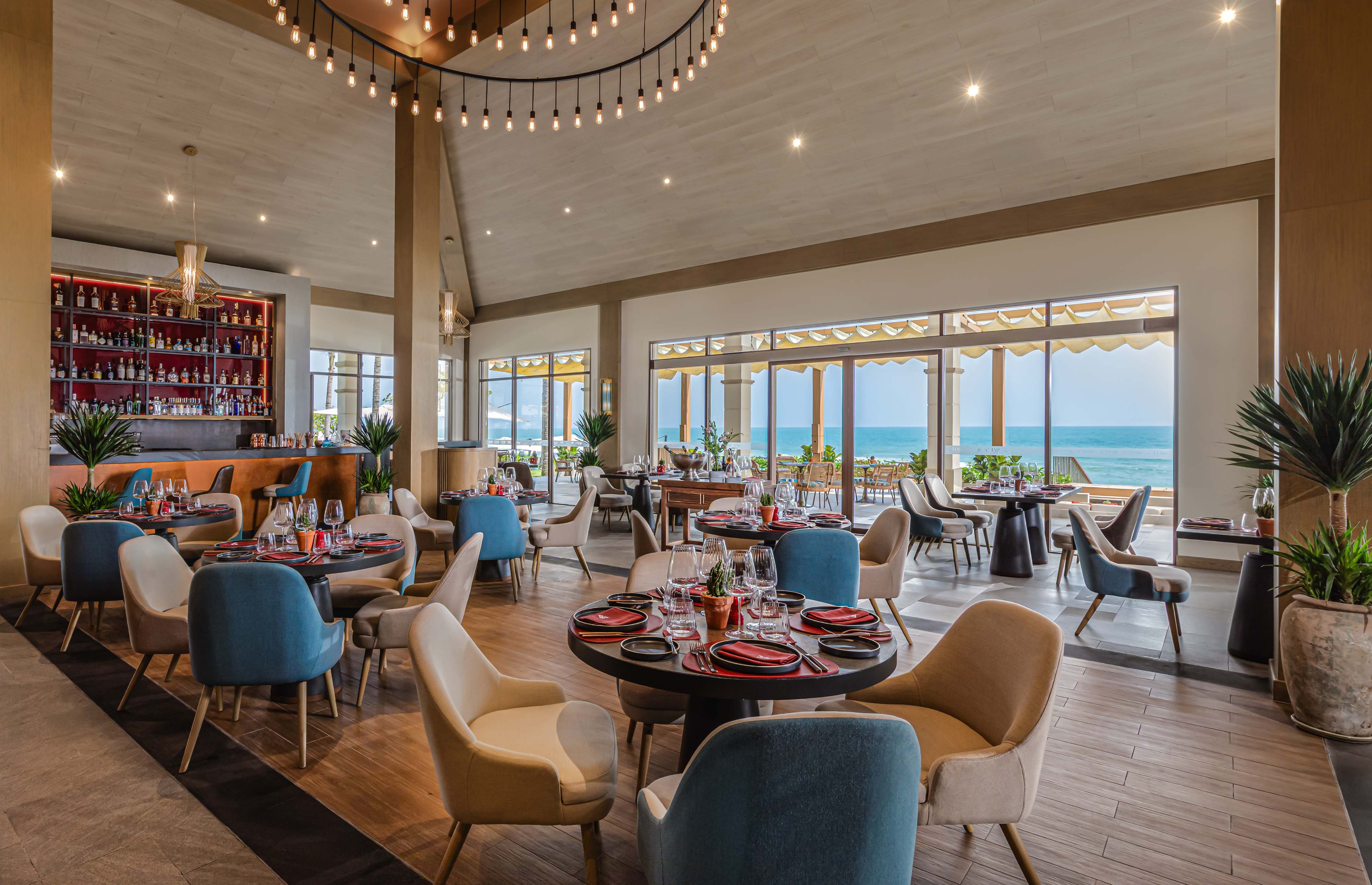 The setting mirrors this philosophy. Indoors, warm tones, refined detailing, and soft lighting create an intimate atmosphere, while the alfresco terrace opens directly to the sea, inviting guests to dine under evening breezes and a horizon that shifts with the light. A carefully curated wine cellar supports the menu with structure and balance, offering pairings that enhance rather than overshadow the cuisine.