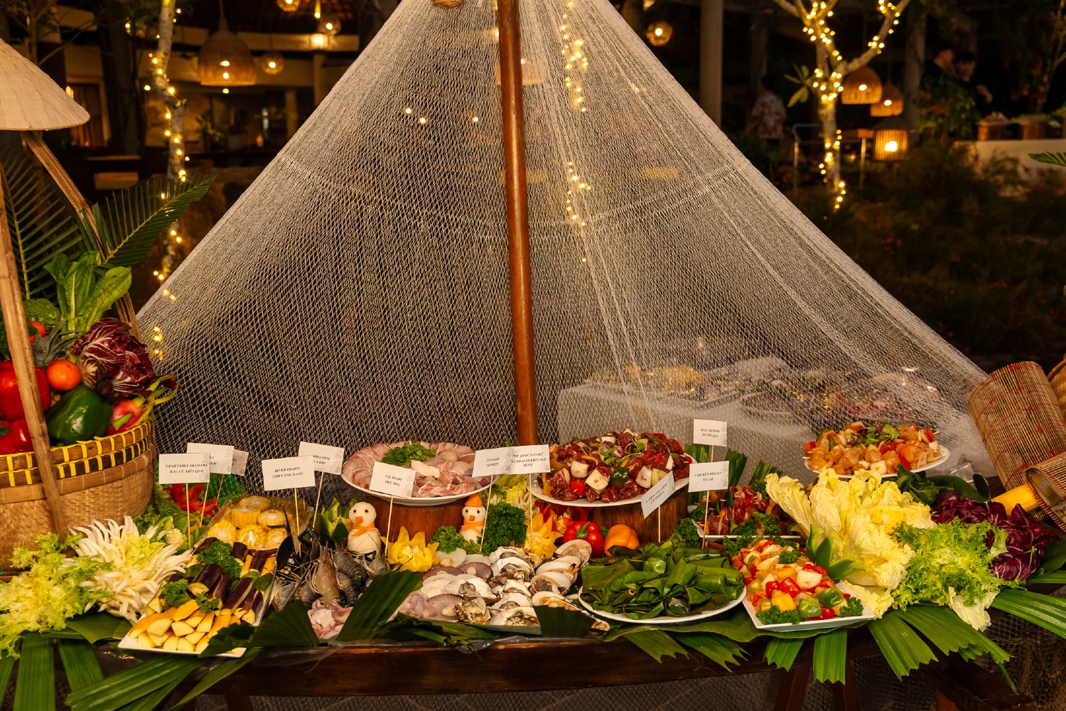 A vibrant evening of gourmet dining, live entertainment, and beachfront festivities including bamboo dance, fire performances, and a bonfire countdown.