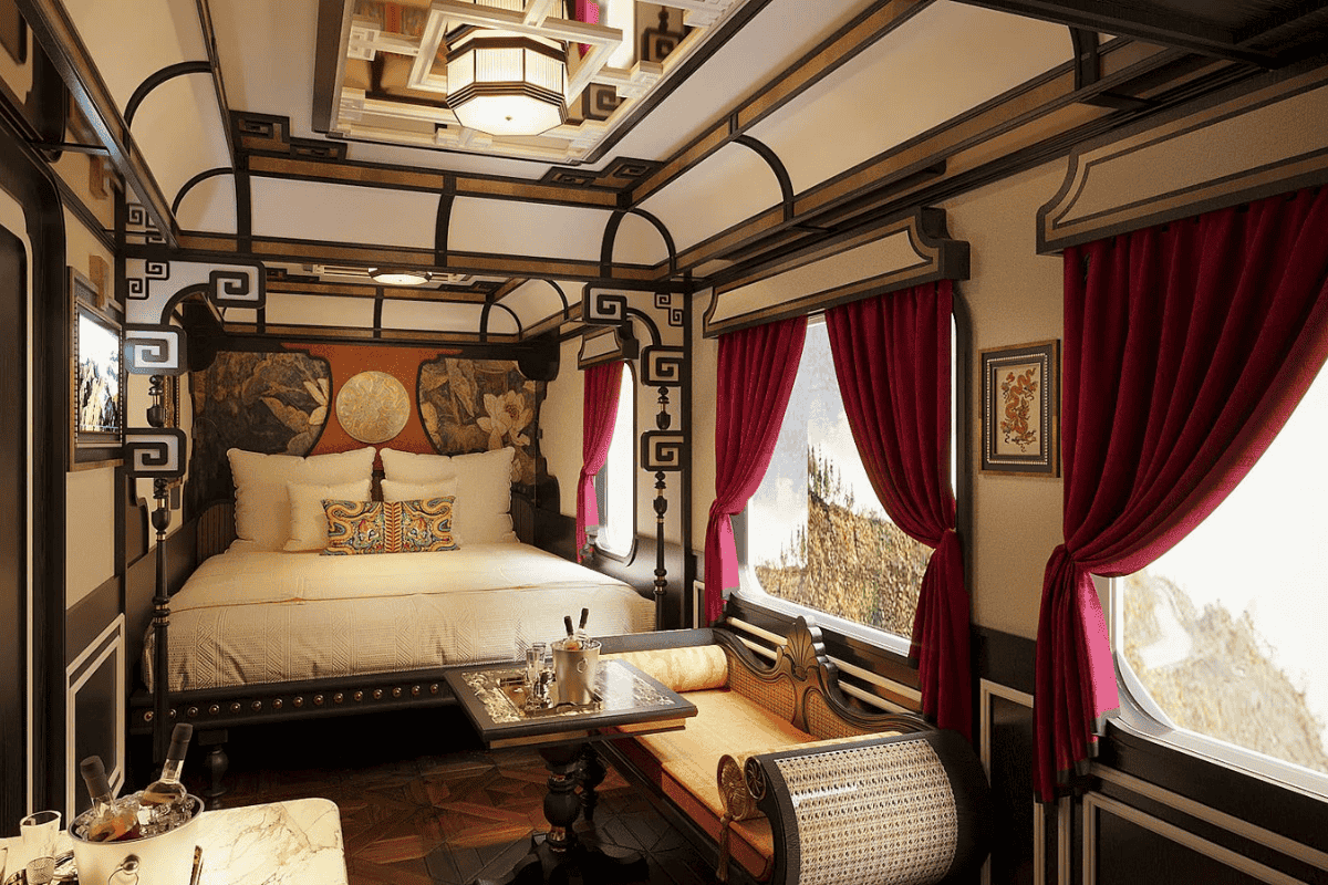 Onboard, SJourney unfolds as a carefully composed world. Thirteen carriages house sleeper cabins, two restaurants, and a central kitchen, all envisioned in a refined Indochine aesthetic. Bamboo, polished wood, and handcrafted details create a dialogue between Vietnamese heritage and French colonial influence. Each cabin reflects the standards of a five-star suite, elevated by discreet yet attentive butler service.