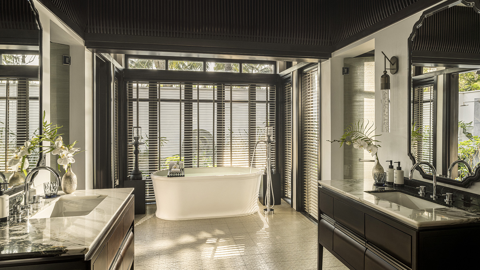 The bathrooms are a study in balance Panda White marble and seeded glass, the cool touch of stone against the lush view of tropical gardens. A freestanding bathtub rests beneath a framed window, where guests may watch the rain fall softly into the green.